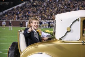 Stephen Webber looks out at the Homecoming Game crowd during his victory ride in the Ramblin’ Wreck, following the announcement of his win of the Mr. Georgia Tech title back in 2013.
