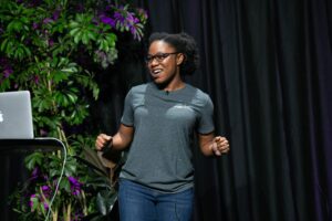 Cecili Poole, who describes public speaking as an element of her post-graduation life that’s one of the things she’s most proud of, addresses an audience at a software engineering conference in 2019.